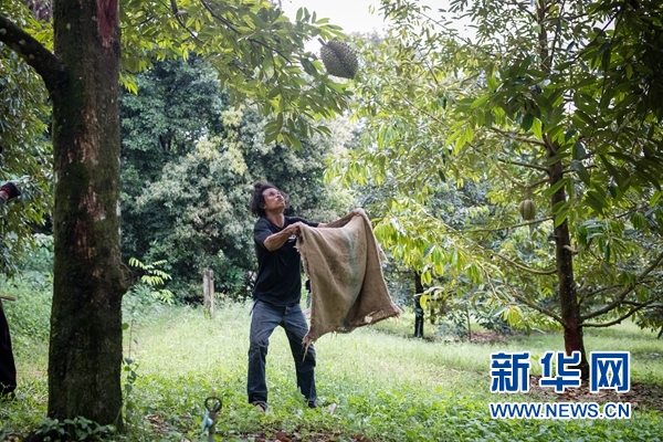 泰國(guó)莊他武里府果園中,一個(gè)工人在樹(shù)下以麻袋接住摘下的榴蓮。新華網(wǎng)發(fā) (阿里巴巴提供)