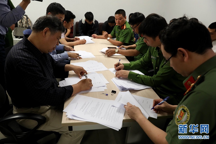 4月28日,中越警方簽署移交相關(guān)文件。當(dāng)日,越南警方在河內(nèi)內(nèi)排國際機(jī)場向中國警方工作組移交了許某等8名涉嫌詐騙罪的在逃嫌疑人。中國警方“獵狐行動”在越南再獲新成果。新華社記者王迪攝