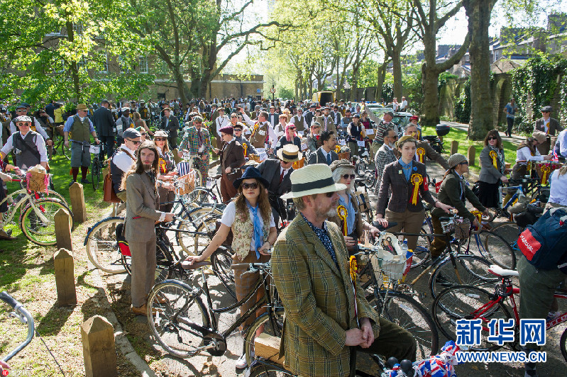 當?shù)貢r間2018年5月5日,英國倫敦,當?shù)嘏e辦復古騎行活動,民眾身穿花呢子服裝騎車穿行在倫敦街頭。今年是該活動舉辦十周年。(圖片來源:東方IC)