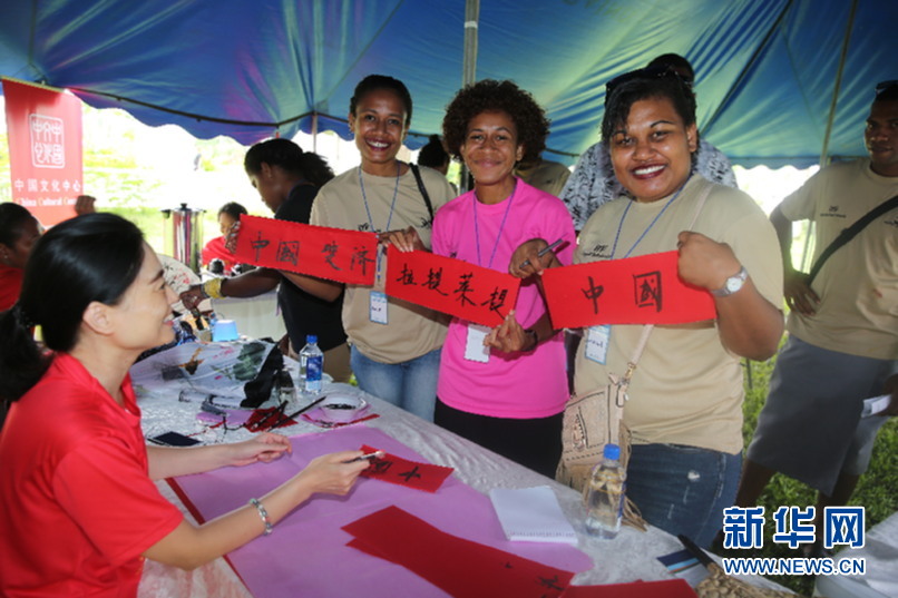 斐濟(jì)青少年在展示她們的毛筆字杰作。 新華網(wǎng)記者張永興 攝