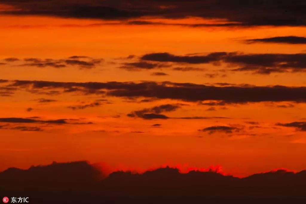 隨著暫短的陣雨飄過(guò),外灘天空飄過(guò)美麗的紅云,一位市民正在跑步。