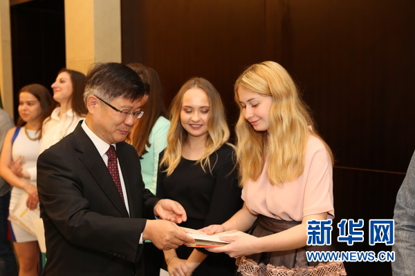 中國駐白俄羅斯大使崔啟明向白俄羅斯學(xué)生頒發(fā)獎(jiǎng)學(xué)金。新華網(wǎng)記者 魏忠杰攝