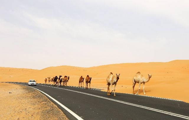 阿聯(lián)酋利瓦沙漠公路上的駝隊(duì)。新華社記者 李震攝
