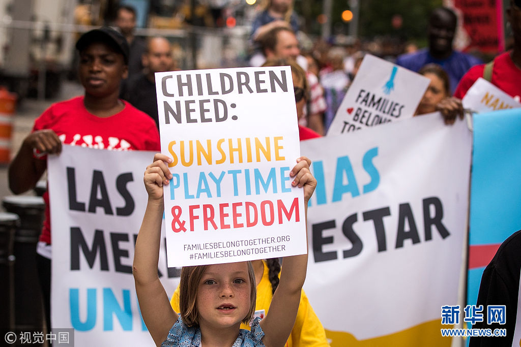 當?shù)貢r間2018年7月18日,美國紐約,包括托兒所從業(yè)人員、父母及其子女在內(nèi)的社會各界人士在美國移民和海關(guān)執(zhí)法局(ICE)附近組織示威游行,抗議特朗普政府近期在美國南部邊境實施針對非法移民家庭的強制拘留和家庭成員離散政策。 當天,共和黨領(lǐng)導的眾議院通過了支持ICE的決議,并譴責一些民主黨人和進步積極分子要求廢除ICE的呼聲。(圖片來源:視覺中國)