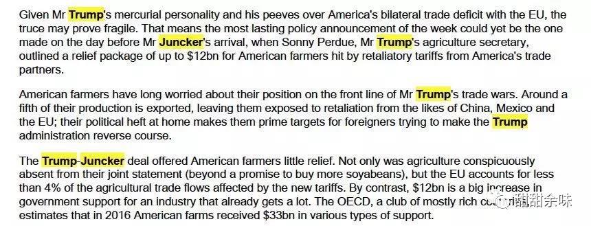 2.從英國(guó)媒體的報(bào)道切入點(diǎn)來看,英國(guó)作為歐洲國(guó)家的重要代表(雖然英國(guó)已經(jīng)發(fā)布了脫歐白皮書,但是在歐盟的官網(wǎng)上,歐盟的28個(gè)國(guó)家里,目前仍然是包括了United Kingdom的),對(duì)美國(guó)對(duì)外咋咋呼呼給各國(guó)添亂、實(shí)際上不動(dòng)聲色自有打算的做法并不感冒。管中窺豹,或可判斷容克代表歐盟剛剛表過的態(tài)的不確定性將進(jìn)一步上升,除了德國(guó)、法國(guó)之外,英國(guó)也不可能真的跟美國(guó)好到一個(gè)鼻孔出氣。更不要說在歐盟內(nèi)部農(nóng)業(yè)出口占大頭的其他國(guó)家。