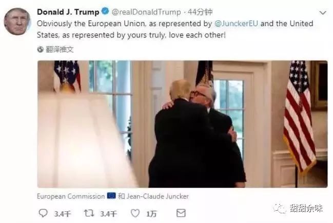 畢竟,到訪美國(guó)的歐盟委員會(huì)主席容克,不僅得到了美國(guó)媒體濃墨重彩的報(bào)道,更在特朗普的推特上,將白宮玫瑰園的浪漫延續(xù)了下去——《經(jīng)濟(jì)學(xué)人》給這次見面取了個(gè)唯美貼切的標(biāo)題:Sealed with a kiss(以吻封緘)。(哈哈哈,莫名覺得這首歐美經(jīng)典情歌用在這里居然有說不出的貼切,《經(jīng)濟(jì)學(xué)人》取標(biāo)題的能力也真是要給個(gè)大寫的服字!)
