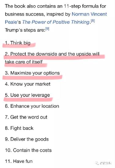 白宮及特朗普近期的表現(xiàn)看似散亂反復(fù),實(shí)際上并非無跡可循。有個(gè)重要的樣本,就是特朗普本人的作品《交易的藝術(shù)》(The Art of the Deal)。他在書中回顧自己各種交易經(jīng)歷,總結(jié)出11條重要步驟。
