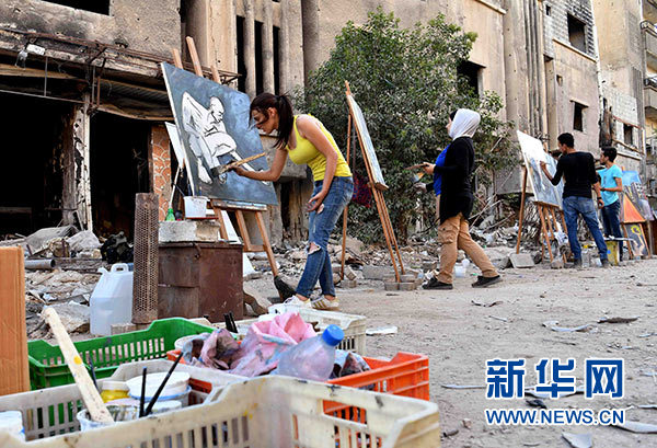 8月16日,在敘利亞首都大馬士革,年輕畫家們?cè)谝疇柲驴穗y民營廢墟前作畫。? 新華社發(fā)(阿馬爾 攝)
