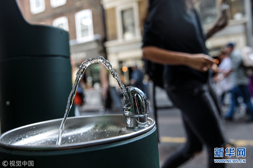 當?shù)貢r間2018年8月28日,英國倫敦,民眾在公共飲水機旁飲水。倫敦市長近日引進了20個新的公共飲水機,鼓勵人們自帶杯子取水喝,從而減少塑料垃圾。 (圖片來源:視覺中國)
