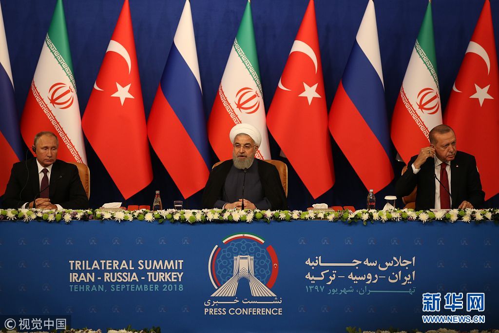 當(dāng)?shù)貢r間2018年9月7日,伊朗德黑蘭,當(dāng)日,俄羅斯、土耳其和伊朗三國首腦齊聚伊朗首都德黑蘭舉行峰會,討論敘利亞局勢。(圖片來源:視覺中國)
