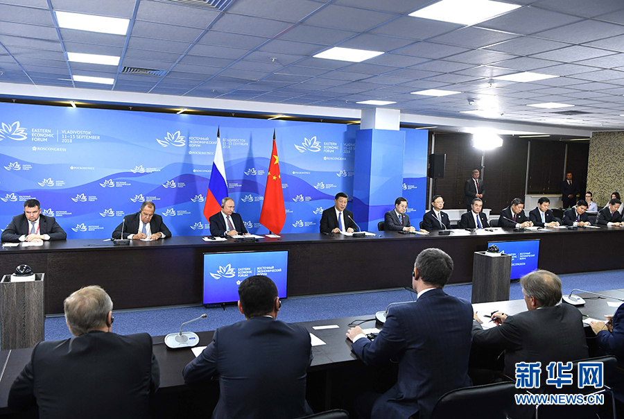 9月11日,國家主席習(xí)近平在符拉迪沃斯托克和俄羅斯總統(tǒng)普京共同出席中俄地方領(lǐng)導(dǎo)人對話會。 新華社記者 饒愛民 攝