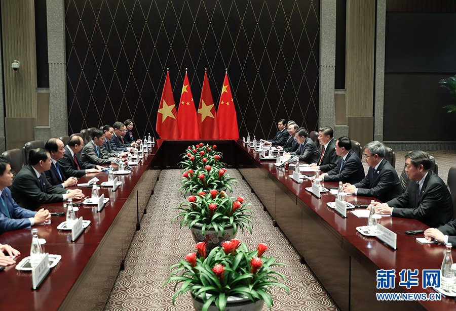 11月4日,國家主席習(xí)近平在上海會(huì)見越南總理阮春福。 新華社記者 丁海濤 攝