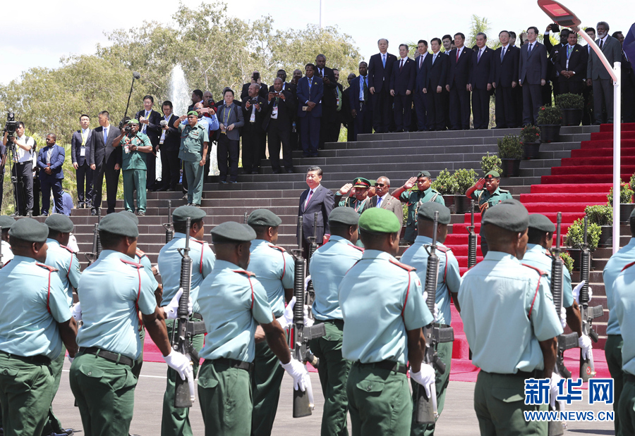 當(dāng)?shù)貢r(shí)間上午10時(shí)30分許,習(xí)近平乘車抵達(dá)議會(huì)大廈,受到達(dá)達(dá)埃熱情迎接。兩國(guó)領(lǐng)導(dǎo)人登上檢閱臺(tái)。軍樂隊(duì)奏中巴新兩國(guó)國(guó)歌?,F(xiàn)場(chǎng)鳴21響禮炮。習(xí)近平在達(dá)達(dá)埃陪同下檢閱儀仗隊(duì)。檢閱畢,習(xí)近平同巴新方主要官員握手,達(dá)達(dá)埃同中方陪同人員握手。兩國(guó)領(lǐng)導(dǎo)人共同前往議會(huì)大廈會(huì)見廳,巴布亞新幾內(nèi)亞議長(zhǎng)波馬特等在大廈外迎接并陪同會(huì)見。