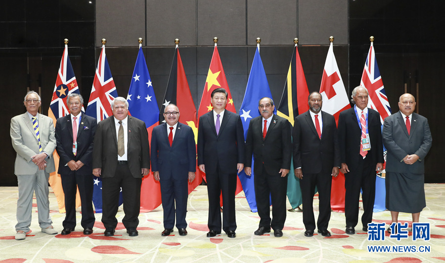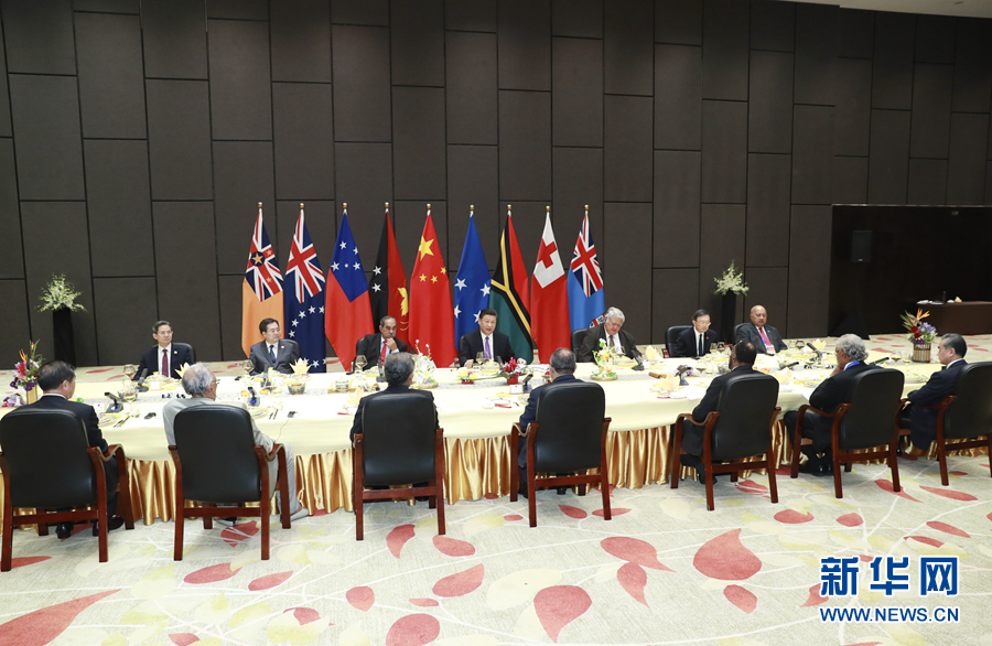 11月16日,國家主席習(xí)近平在莫爾茲比港同巴布亞新幾內(nèi)亞總理奧尼爾、密克羅尼西亞聯(lián)邦總統(tǒng)克里斯琴、薩摩亞總理圖伊拉埃帕、瓦努阿圖總理薩爾瓦伊、庫克群島總理普納、湯加首相波希瓦、紐埃總理塔拉吉等建交太平洋島國領(lǐng)導(dǎo)人以及斐濟(jì)政府代表、國防部長昆布安博拉舉行集體會晤。習(xí)近平主持會晤并發(fā)表主旨講話。 新華社記者 龐興雷 攝