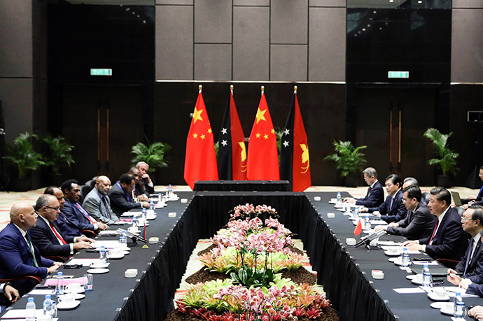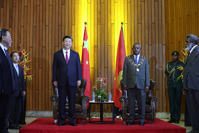 11月16日,國(guó)家主席習(xí)近平在莫爾茲比港分別會(huì)見(jiàn)建交太平洋島國(guó)領(lǐng)導(dǎo)人。這是習(xí)近平會(huì)見(jiàn)紐??偫硭?。新華社記者 丁林 攝