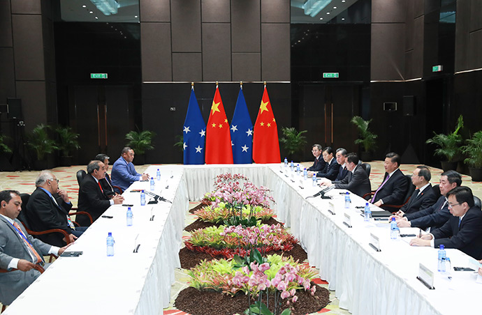 11月16日,國(guó)家主席習(xí)近平在莫爾茲比港分別會(huì)見(jiàn)建交太平洋島國(guó)領(lǐng)導(dǎo)人。這是習(xí)近平會(huì)見(jiàn)密克羅尼西亞聯(lián)邦總統(tǒng)克里斯琴。新華社記者 謝環(huán)馳 攝