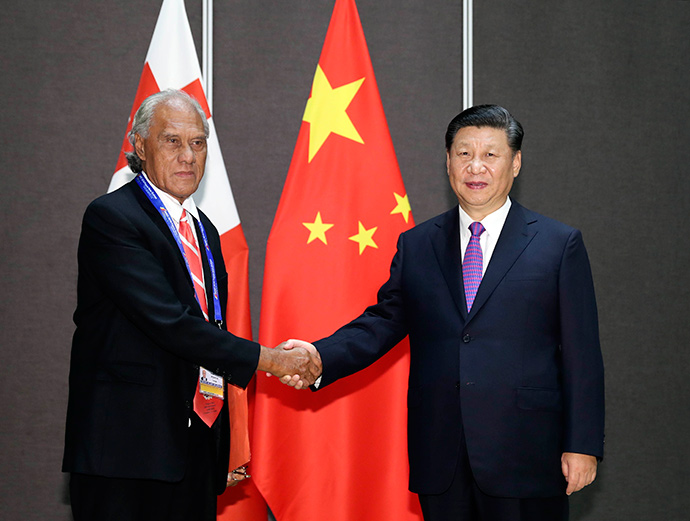 11月16日,國(guó)家主席習(xí)近平在莫爾茲比港分別會(huì)見(jiàn)建交太平洋島國(guó)領(lǐng)導(dǎo)人。這是習(xí)近平會(huì)見(jiàn)湯加首相波希瓦。新華社記者 丁林 攝