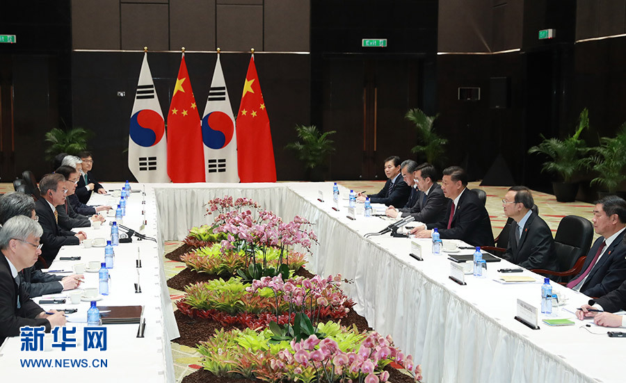 習(xí)近平指出,過去一年,我同總統(tǒng)先生達(dá)成的各項(xiàng)共識(shí)正得到有效落實(shí),兩國關(guān)系穩(wěn)步改善和發(fā)展。我們要不斷深化中韓戰(zhàn)略合作伙伴關(guān)系,共同為促進(jìn)地區(qū)持久和平和繁榮作出積極貢獻(xiàn)。雙方要繼續(xù)發(fā)揮好高層引領(lǐng)作用,尊重彼此核心利益和重大關(guān)切,加強(qiáng)溝通,建立和鞏固互信,繼續(xù)妥善處理好敏感問題。要重點(diǎn)推進(jìn)共建“一帶一路”,加快兩國自由貿(mào)易協(xié)定第二階段談判,推動(dòng)雙邊互利合作優(yōu)化升級。要加強(qiáng)在亞太經(jīng)合組織、二十國集團(tuán)、中日韓等多邊框架內(nèi)協(xié)調(diào)和合作。