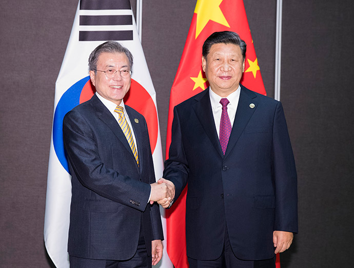 11月17日,國家主席習(xí)近平在莫爾茲比港會見韓國總統(tǒng)文在寅。新華社記者 黃敬文 攝