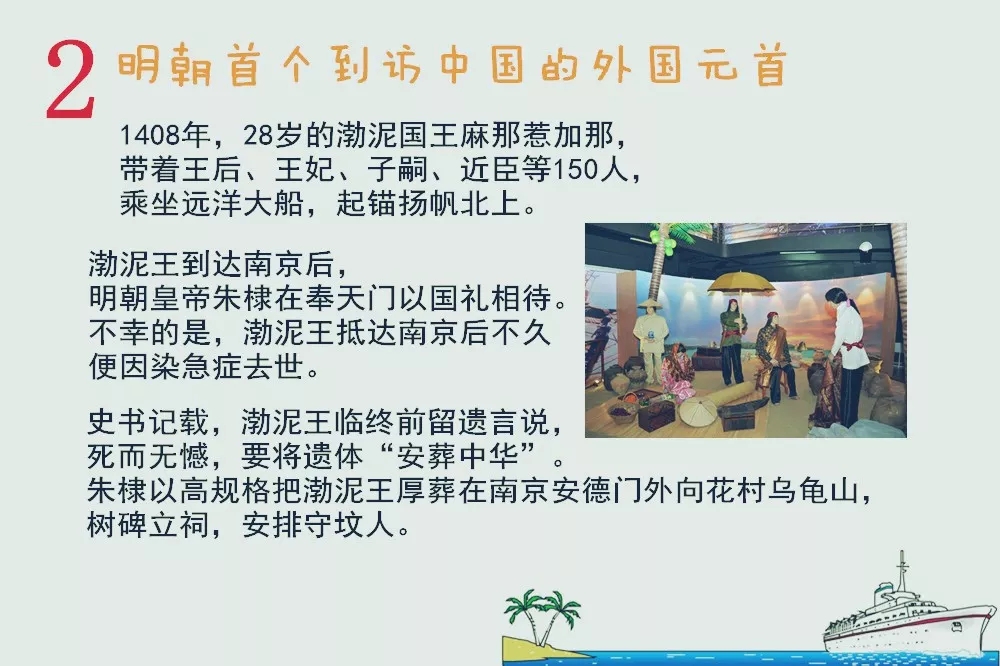 因擔(dān)心渤泥政局動蕩,朱棣還特派張謙、周航兩位使臣護送太子遐旺返回渤泥襲王位并助他鎮(zhèn)守一年。1412年農(nóng)歷九月,新國王遐旺帶著母親、叔父等一批人再次訪華。明朝歷史上,外國國王來訪,渤泥王麻那惹加那是第一人。