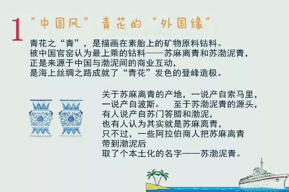然而,很少有人知道,青花雖是“中國風(fēng)”,但卻有段“外國緣”。青花之“青”,是描畫在素胎上的礦物原料鈷料。被中國官窯認為最上乘的鈷料——蘇麻離青和蘇渤泥青,正是來源于中國與渤泥間的商業(yè)互動,是海上絲綢之路成就了“青花”發(fā)色的登峰造極。