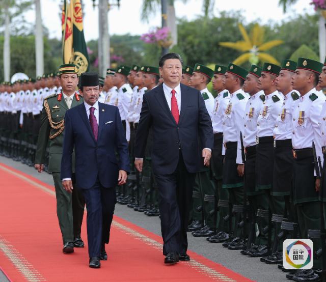 11月19日,國(guó)家主席習(xí)近平在斯里巴加灣同文萊蘇丹哈桑納爾舉行會(huì)談。會(huì)談開(kāi)始前,習(xí)近平出席哈桑納爾在王宮前廣場(chǎng)舉行的盛大歡迎儀式。這是在哈桑納爾陪同下,習(xí)近平檢閱儀仗隊(duì)。新華社記者 鞠鵬 攝