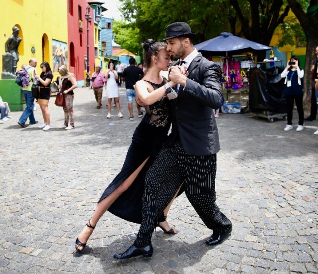 在布宜諾斯艾利斯市博卡區(qū),一對舞者當(dāng)街跳起探戈。(新華社記者姚大偉攝)