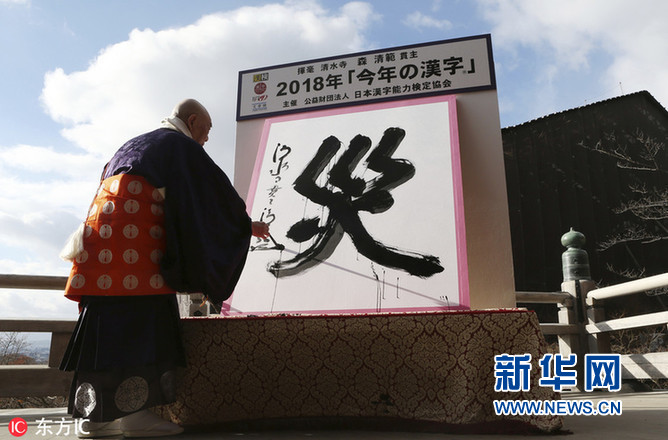 當(dāng)?shù)貢r間2018年12月12日,日本京都,京都清水寺住持森清范在巨幅和紙上揮毫寫下了今年的年度漢字——“災(zāi)”。(圖片來源:東方IC)