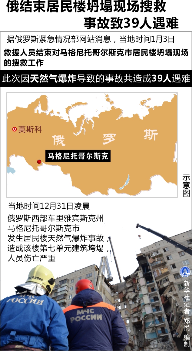 新華社莫斯科1月3日電(記者欒海)據(jù)俄羅斯緊急情況部網(wǎng)站消息,救援人員3日結(jié)束對(duì)馬格尼托哥爾斯克市居民樓坍塌現(xiàn)場的搜救工作,此次因天然氣爆炸導(dǎo)致的事故共造成39人遇難。