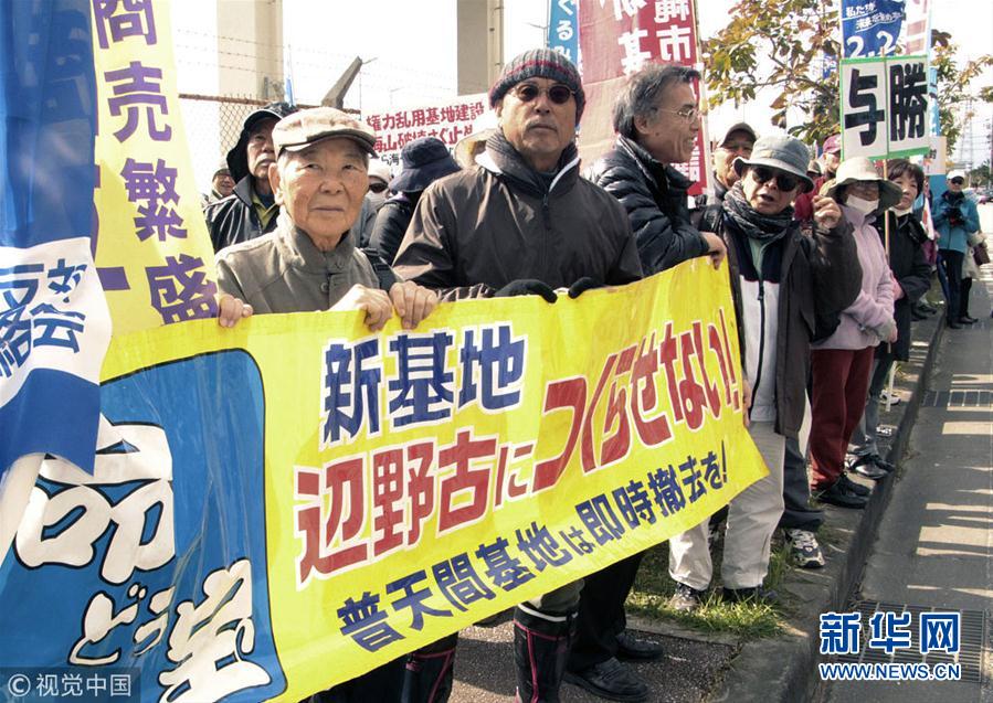 當(dāng)?shù)貢r間2019年1月26日,日本沖繩縣名護(hù),民眾在美國海軍陸戰(zhàn)隊施瓦布軍營門前舉行集會,呼吁在2月24日的地方公投中投票反對美國海軍陸戰(zhàn)隊普天間空軍基地的搬遷計劃。(圖片來源:視覺中國)