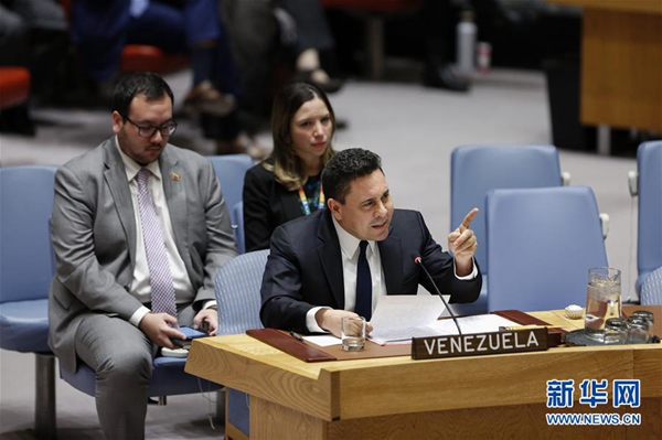 2月28日,在位于紐約的聯(lián)合國總部,委內瑞拉常駐聯(lián)合國代表薩穆埃爾·蒙卡達(前)在安理會會議上發(fā)言。 新華社記者 李木子 攝