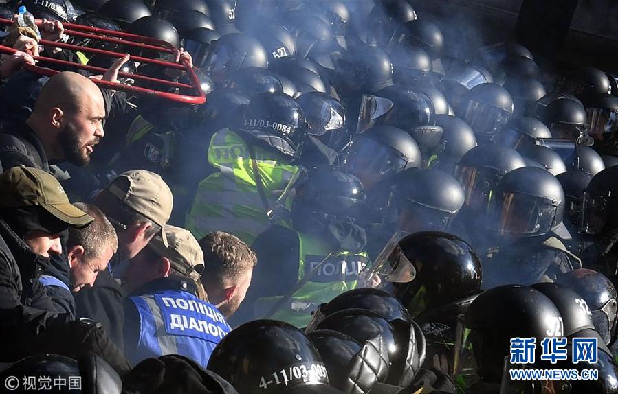 當(dāng)?shù)貢r(shí)間2019年3月9日,烏克蘭基輔,烏克蘭民族主義政黨的激進(jìn)分子集會(huì)要求調(diào)查烏克蘭武裝部隊(duì)官員的腐敗問(wèn)題,與警方發(fā)生激烈沖突。(圖片來(lái)源:視覺(jué)中國(guó))