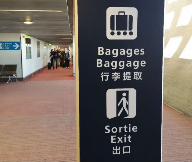 戴高樂(lè)國(guó)際機(jī)場(chǎng)內(nèi)的中文提示語(yǔ)。新華社記者 孫浩 攝