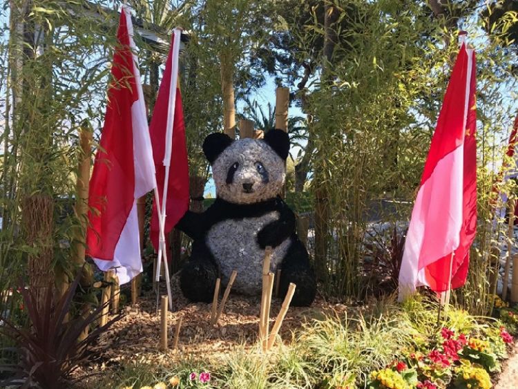 為迎接中國貴賓,摩納哥街心花園立起一個(gè)大熊貓雕塑。新華社記者趙丁喆攝