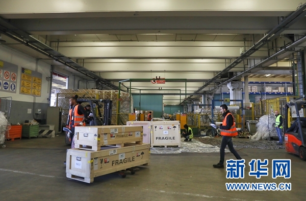 4月9日,在意大利米蘭馬爾彭薩機(jī)場(chǎng),工作人員將中國(guó)流失文物藝術(shù)品運(yùn)送上飛機(jī)。 新華社記者 程婷婷 攝