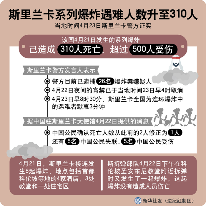 新華社科倫坡4月23日電(記者朱瑞卿 唐璐)斯里蘭卡警方23日證實(shí),該國(guó)21日發(fā)生的系列爆炸已造成310人死亡、超過(guò)500人受傷。