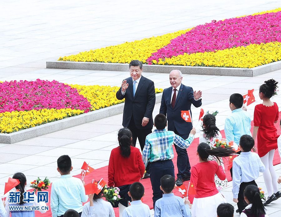 4月29日,國家主席習(xí)近平在北京人民大會堂同瑞士聯(lián)邦主席毛雷爾舉行會談。這是會談前,習(xí)近平在人民大會堂東門外廣場為毛雷爾舉行歡迎儀式。 新華社記者 謝環(huán)馳 攝
