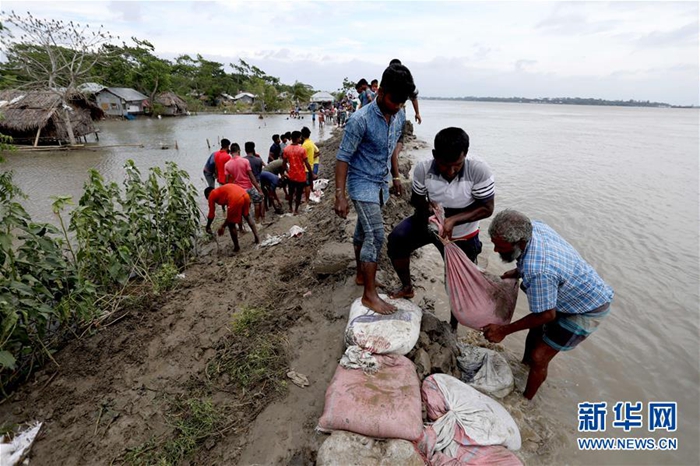 5月4日,在孟加拉國庫爾納,人們修補沙袋路堤。新華社發(fā)