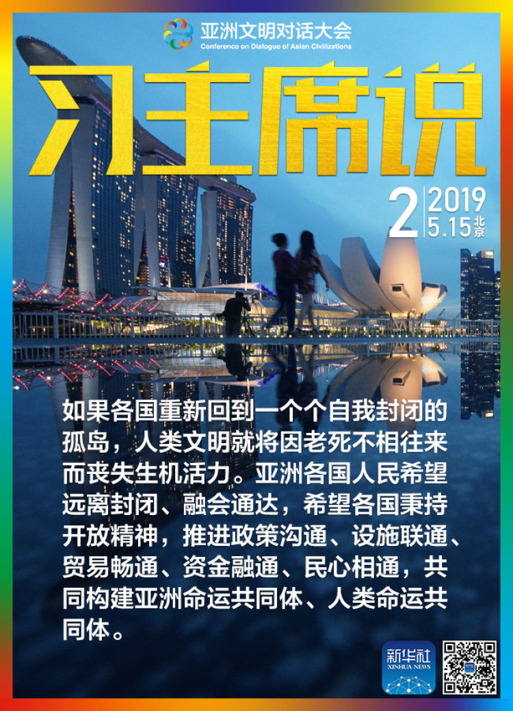如果各國(guó)重新回到一個(gè)個(gè)自我封閉的孤島,人類文明就將因老死不相往來而喪失生機(jī)活力。亞洲各國(guó)人民希望遠(yuǎn)離封閉、融會(huì)通達(dá),希望各國(guó)秉持開放精神,推進(jìn)政策溝通、設(shè)施聯(lián)通、貿(mào)易暢通、資金融通、民心相通,共同構(gòu)建亞洲命運(yùn)共同體、人類命運(yùn)共同體。