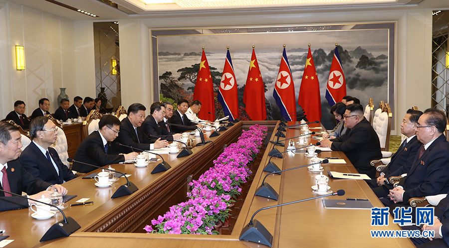 習(xí)近平指出,去年以來,我和委員長同志4次會晤,書寫了中朝關(guān)系新篇章,并結(jié)下了深厚友誼。感謝金正恩委員長同志為我這次訪問舉行的隆重而熱烈的歡迎儀式,我今天從下飛機(jī)到抵達(dá)住處,所到之處無不感受到中朝一家親的濃厚氛圍。今年是中朝建交70周年,在兩黨兩國關(guān)系發(fā)展史上具有承前啟后、繼往開來的重要意義,我又同金正恩委員長在平壤會面。我這次是為鞏固傳承中朝友誼而來,為推動朝鮮半島問題政治解決進(jìn)程而來。相信以這次訪問為契機(jī),我們一定會共同擘畫中朝關(guān)系美好未來,共同開啟中朝友誼嶄新篇章。