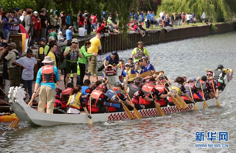 6月22日,由芝加哥華商會舉辦的第19屆芝加哥龍舟賽在中國城譚繼平公園舉行,這是參賽的隊員在比賽。記者 汪平 攝