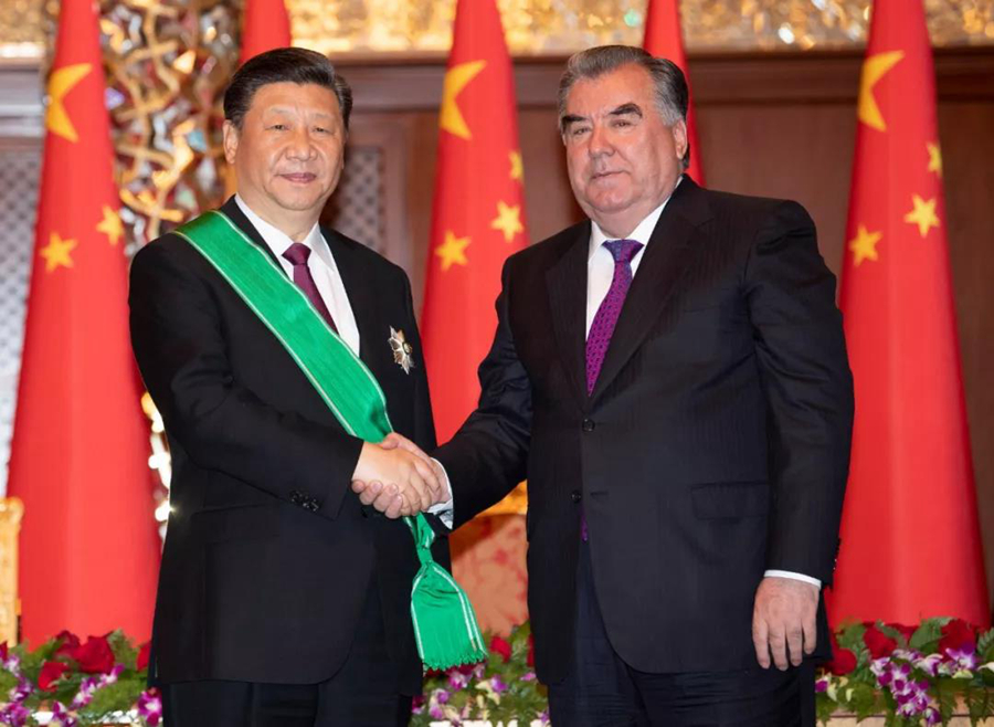 ↑熱恩別科夫總統(tǒng)和拉赫蒙總統(tǒng)分別向習主席授予各自國家最高獎章,感謝習主席為發(fā)展吉中、塔中友誼所作的卓越貢獻。照片分別由新華社記者謝環(huán)馳、沙達提攝