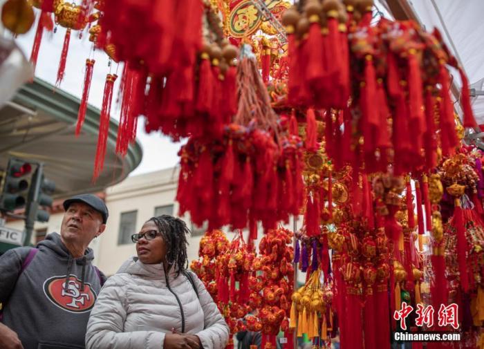 市民在舊金山“中國(guó)城”的春節(jié)花市上被各種飾品吸引。中新社記者 劉關(guān)關(guān) 攝