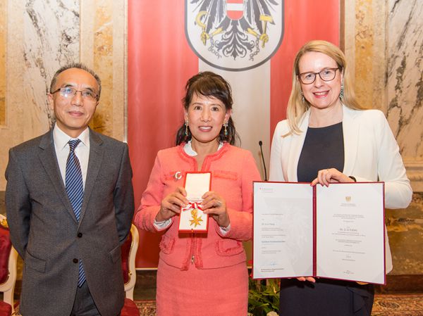 楊麗博士是2002年來第一位獲此殊榮的華人,也是獲得此項勛章的第一位華人女性。奧地利經濟部長瑪加麗特·施拉姆伯克親自向她頒發(fā)勛章和榮譽證書。中國駐奧地利大使李曉駟出席頒獎儀式。