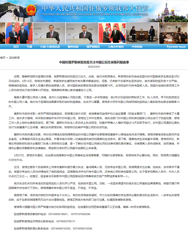 近日,使館注意到個(gè)別自媒體上傳言稱莫斯科警方暴力執(zhí)法,虐待隔離人員,無(wú)故帶走中國(guó)公民。我館高度關(guān)注此事。經(jīng)核實(shí),該傳言并不屬實(shí)。被警方帶走的人員均涉嫌違反了俄防疫規(guī)定,且隔離地點(diǎn)并非只有中國(guó)公民,還有俄公民和其他國(guó)家公民。處于醫(yī)學(xué)觀察的人員中,中方人員只占約三分之一。經(jīng)查證,造謠者與日前散布中國(guó)公民因感染冠狀病毒被俄方拋尸荒野謠言者系同一人。