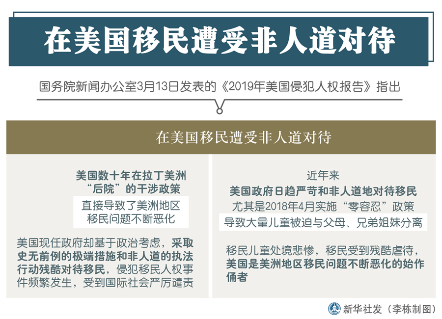 新華社北京3月13日電(記者王鵬、李超)國務院新聞辦13日發(fā)表的《2019年美國侵犯人權(quán)報告》指出,在美國移民遭受非人道對待。