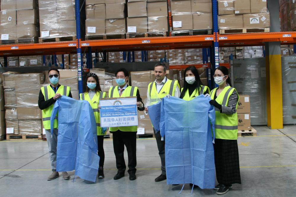 2020年4月20日,英國華僑華人社團(tuán)向英方捐贈醫(yī)用防護(hù)服。(新華社發(fā))