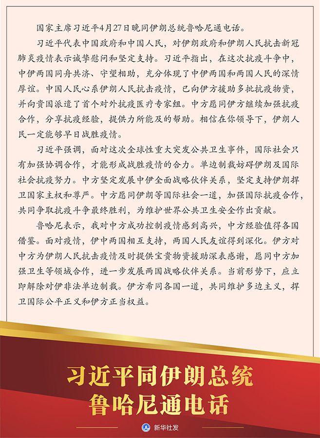 習(xí)近平代表中國政府和中國人民,對伊朗政府和伊朗人民抗擊新冠肺炎疫情表示誠摯慰問和堅(jiān)定支持。習(xí)近平指出,在這次抗疫斗爭中,中伊兩國同舟共濟(jì)、守望相助,充分體現(xiàn)了中伊兩國和兩國人民的深情厚誼。中國人民心系伊朗人民抗擊疫情,已向伊方援助多批抗疫物資,并向貴國派遣了首個(gè)對外抗疫醫(yī)療專家組。中方愿同伊方繼續(xù)加強(qiáng)抗疫合作,分享抗疫經(jīng)驗(yàn),提供力所能及的幫助。相信在你領(lǐng)導(dǎo)下,伊朗人民一定能夠早日戰(zhàn)勝疫情。