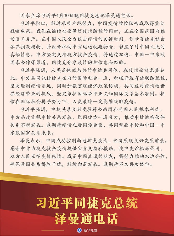 習(xí)近平指出,經(jīng)過艱苦卓絕努力,中國(guó)疫情防控阻擊戰(zhàn)取得重大戰(zhàn)略成果。我們?cè)诶^續(xù)全面做好疫情防控的同時(shí),正在全國(guó)范圍內(nèi)推動(dòng)復(fù)工復(fù)產(chǎn)。在中國(guó)人民全力抗擊疫情的關(guān)鍵時(shí)刻,你號(hào)召捷克社會(huì)各界捐款捐物,并派專機(jī)向中方運(yùn)送抗疫物資,彰顯了對(duì)中國(guó)人民的真摯情感。中方堅(jiān)定支持捷方抗擊疫情,將通過雙邊、中國(guó)-中東歐國(guó)家合作等渠道,同捷克分享疫情防控信息和經(jīng)驗(yàn)。