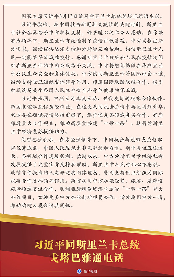 新華社北京5月13日電 國(guó)家主席習(xí)近平5月13日晚同斯里蘭卡總統(tǒng)戈塔巴雅通電話。